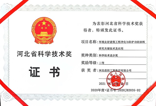 河北晨陽(yáng)工貿(mào)集團(tuán)有限公司《環(huán)境友好建筑工程凈化與防護(hù)功能涂料研究關(guān)鍵技術(shù)及應(yīng)用》項(xiàng)目榮獲河北省科學(xué)技術(shù)進(jìn)步獎(jiǎng)二等獎(jiǎng)。近年來(lái),河北晨陽(yáng)工貿(mào)憑借高質(zhì)量創(chuàng)新成果的落地驗(yàn)證和迭代升級(jí),已多次獲得該項(xiàng)殊榮。