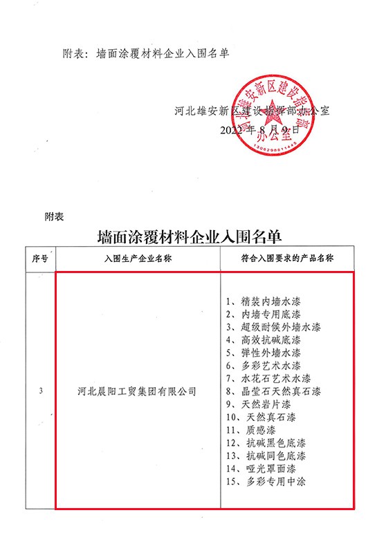 2022年8月9日,雄安新區(qū)建設指揮部辦公室發(fā)布了《關于發(fā)布增補入圍集采目錄墻面涂覆材料企業(yè)名單的通知》。據(jù)墻面涂覆材料企業(yè)入圍名單顯示:河北晨陽工貿(mào)集團有限公司(以下簡稱“晨陽水漆”)共計有15款內(nèi)外墻環(huán)保水漆產(chǎn)品入選。